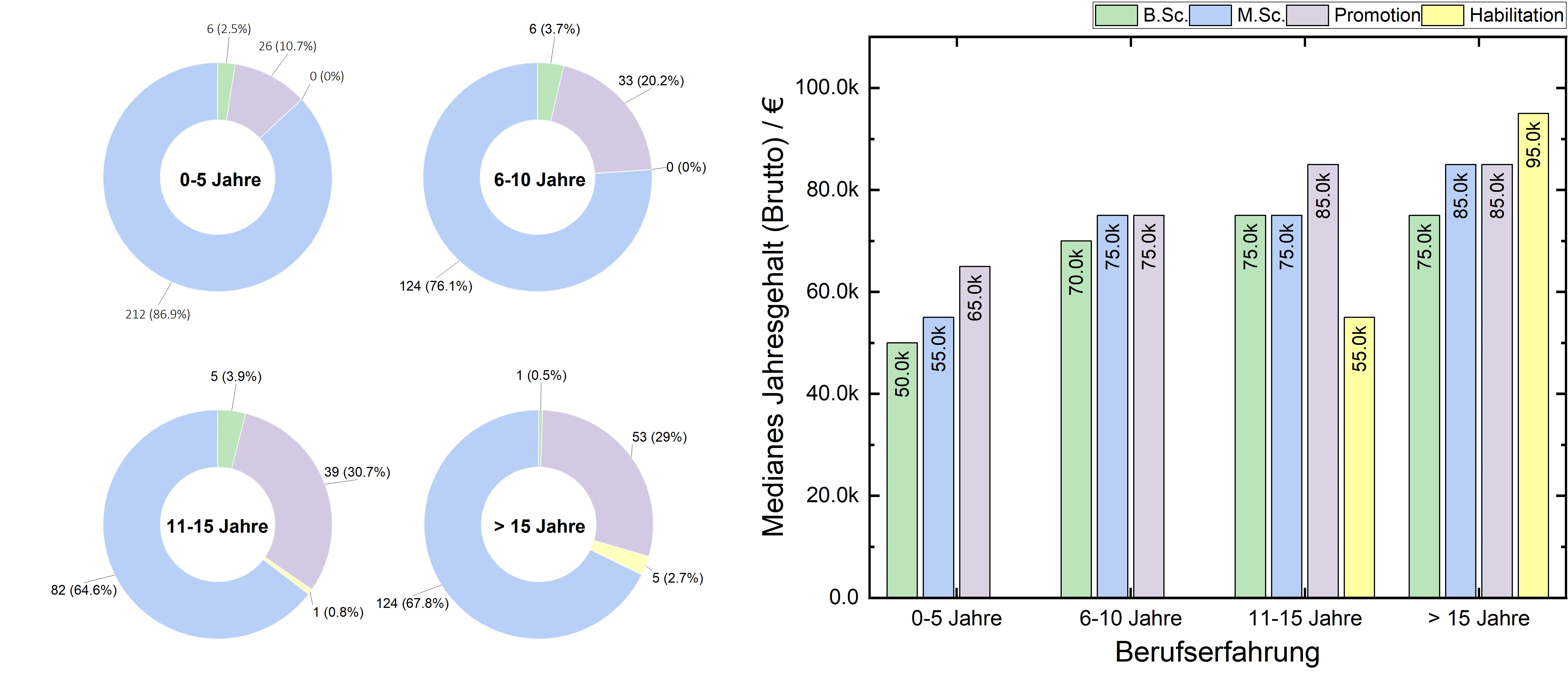 In Abb. 4 sind die Häufigkeitsverteilungen des akademischen Grads sowie das mediane Jahreseinkommen in Abhängigkeit von der Berufserfahrung dargestellt. Zum einen ist zu erkennen, dass Habilitationen i.d.R. erst nach 15 Jahren Berufserfahrung erworben werden, zum anderen wirkt sich insbesondere bei Berufsanfängern (0-5 Jahre Berufserfahrung) ein höherer Abschluss positiv auf das Jahreseinkommen aus: Während Absolventen mit B.Sc. im Durschnitt mit ca. 50.000€/Jahr einsteigen liegt das Einkommen mit M.Sc./Dipl. bereits bei 55.000€/Jahr bzw. mit Promotion sogar bei 65.000€/Jahr.