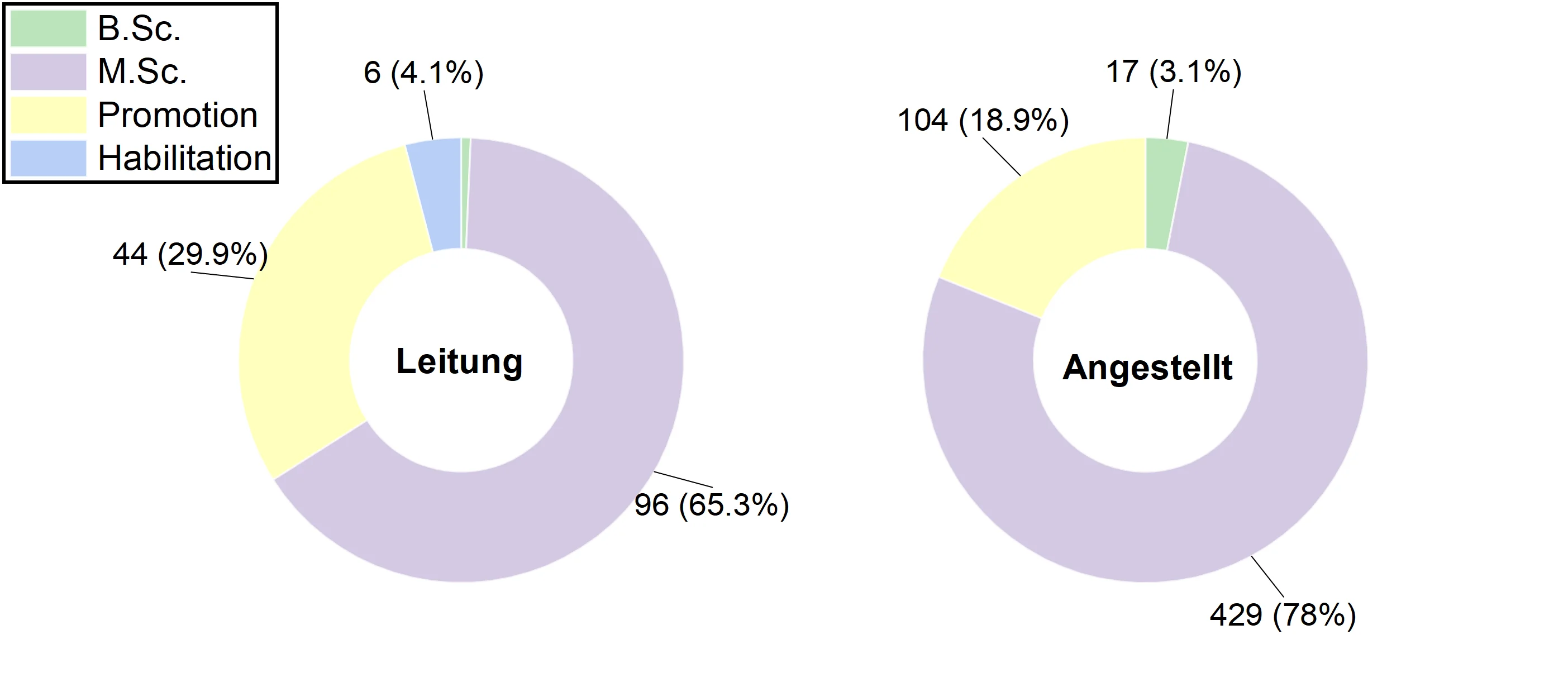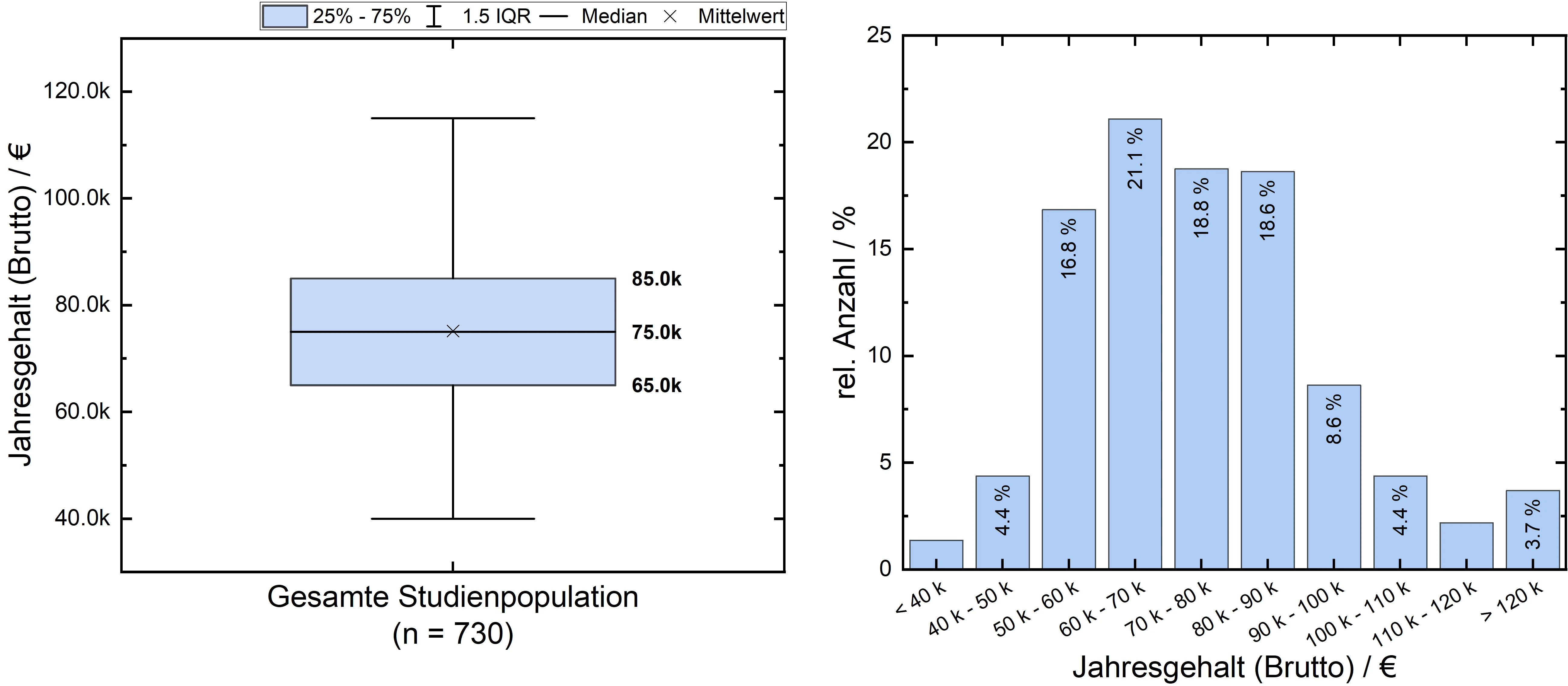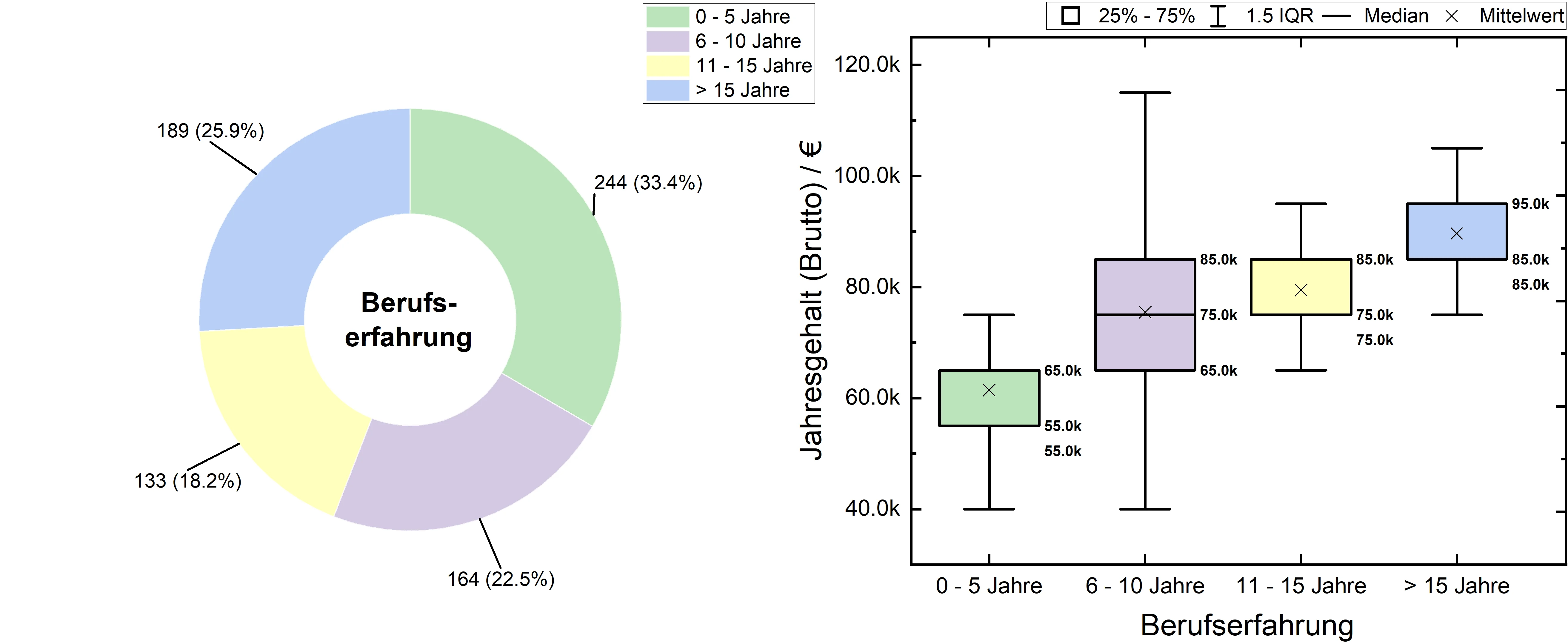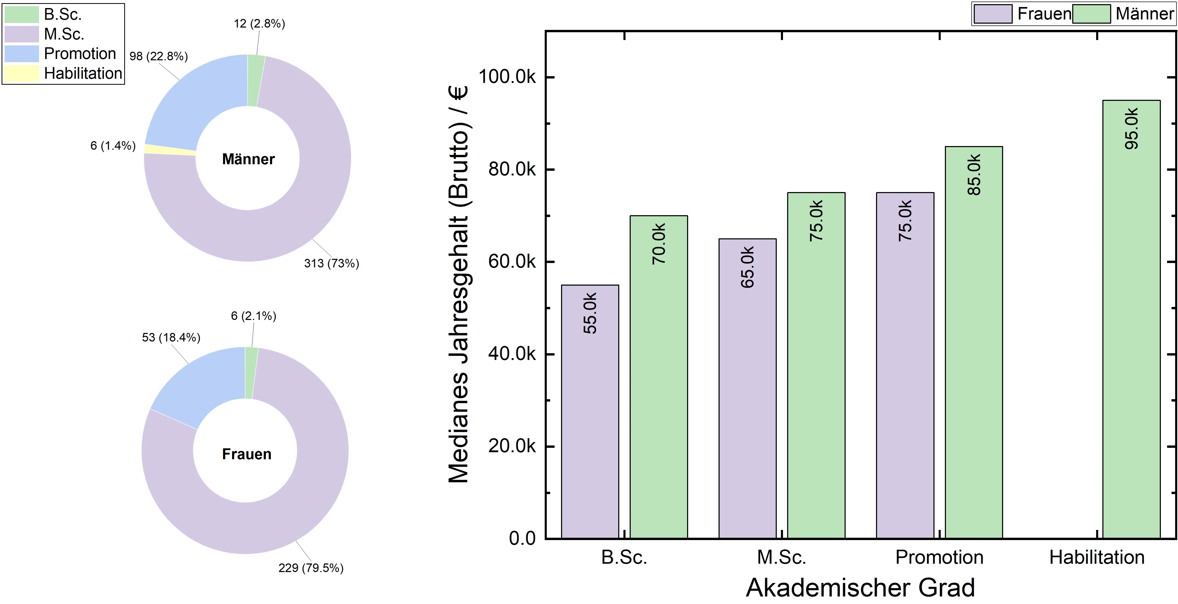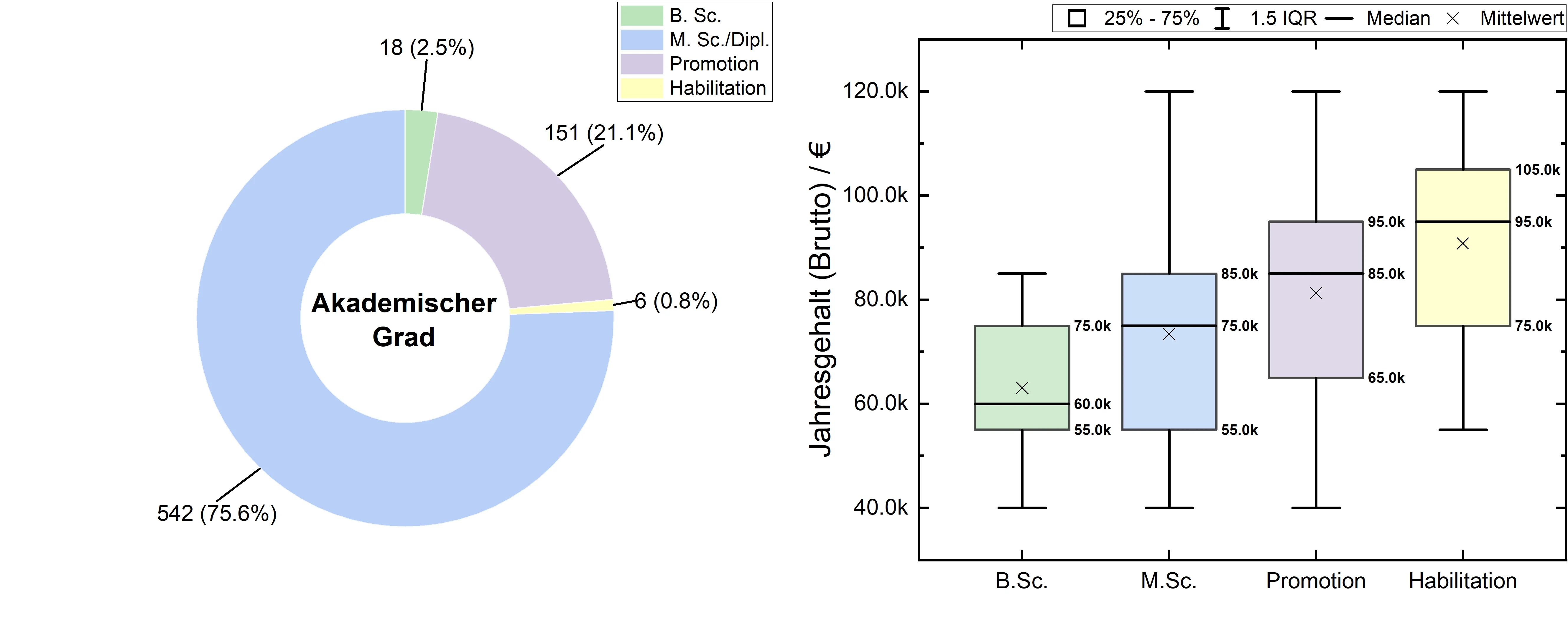 Bei der Abfrage des höchsten erworbenen akademischen Grades konnte zwischen B.Sc, M.Sc/Dipl., Promotion und Habilitation gewählt werden. Die Verteilung der Antworten sind in der Abb. 3 (li.) dargestellt. Das auf den akademischen Grad bezogene angegebene Jahreseinkommen kann Abb. 3 (re.) entnommen werden. Mit höhergradigem Abschluss steigt auch das durchschnittliche Jahreseinkommen an: 60.000€ (B.Sc), 75.000 (M.Sc.), 85.000€ (Promotion) und 95.000 (Habilitation). Trotz des durchschnittlichen Anstiegs können sowohl verhältnismäßig niedrige Jahreseinkommen von <60.000€ bei allen Abschlussgruppen sowie hohe Jahreseinkommen von >100.000€ bei allen Abschlussgruppen mit Ausnahme des B.Sc. beobachtet werden.