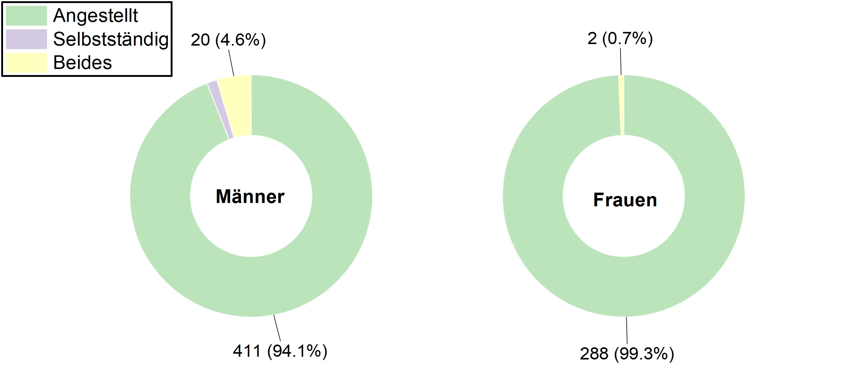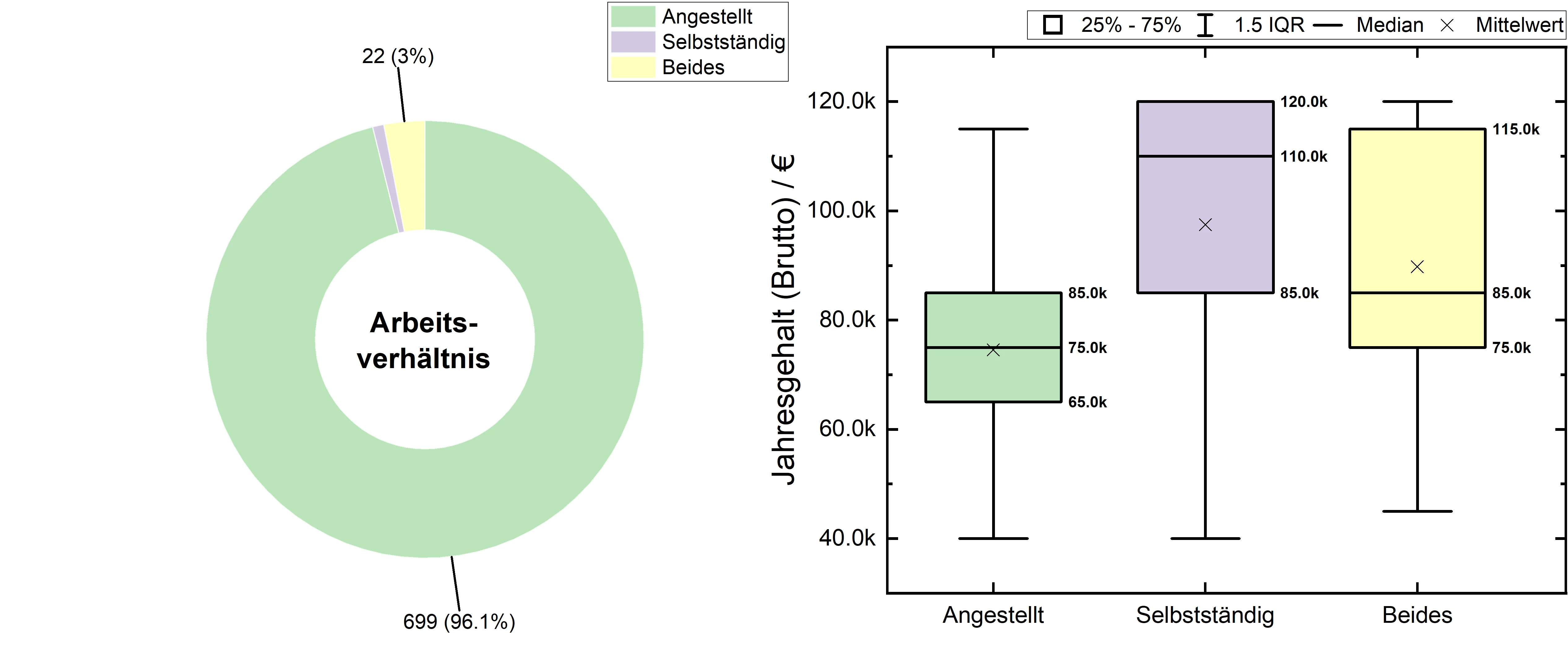 Die Verteilung des angegebenen Arbeitsverhältnisses (angestellt, selbstständig oder beides) ist in Abb. 5 (li.) und die zugehörigen Jahreseinkommen in Abb.5 (re.) dargestellt. Die überwiegende Mehrheit (96,1%) der befragten Personen gab an ausschließlich angestellt tätig zu sein, sodass die Gehaltsverteilung der angestellten Personen auch der Gesamtverteilung (vgl. Abb. 1) entspricht. 22 Personen (3%) gaben an neben der Anstellung zusätzlich Einkünfte aus selbstständigen Tätigkeiten zu generieren und lediglich 6 Personen (0,8%) vollständig selbstständig zu sein. Es ist eine Tendenz erkennbar, dass durch selbständige Tätigkeiten das durchschnittliche Einkommen höher ausfallen kann als im Angestelltenverhältnis. Aufgrund der geringen Statistik in diesen Fällen, kann hierzu jedoch keine klare Aussage getroffen werden.
