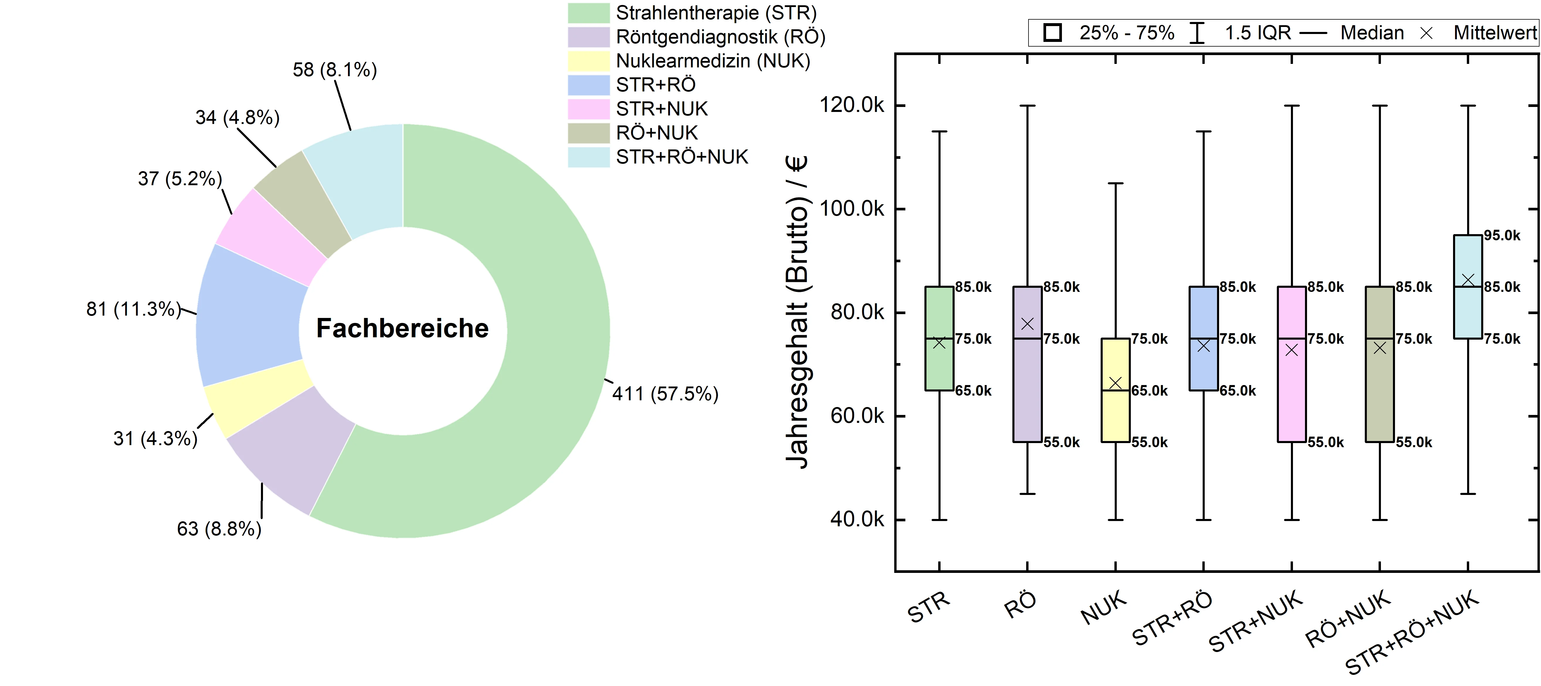 Bei der Abfrage der Tätigkeitsfelder standen die Fachbereiche Strahlentherapie (STR), Röntgendiagnostik (RÖ) und Nuklearmedizin (NUK) zur Wahl (auch eine Mehrfachauswahl war möglich). Die Bereiche Partikel- und Brachytherapie wurden dem Fachbereich Strahlentherapie zugeordnet. Die Häufigkeitsverteilung der angegebenen Tätigkeitsfelder sowie das zugehörige Jahreseinkommen sind in Abb. 15 dargestellt. Die Mehrheit von 57,5% der befragten Personen ist ausschließlich in der Strahlentherapie, 8,8% ausschließlich in der Röntgendiagnostik und lediglich 4,3% ausschließlich in der Nuklearmedizin tätig. Die häufigste Kombination zweier Fachbereiche ist Strahlentherapie + Röntgendiagnostik (11,3%). Immerhin 8,1% gaben an in allen drei Bereichen tätig zu sein.