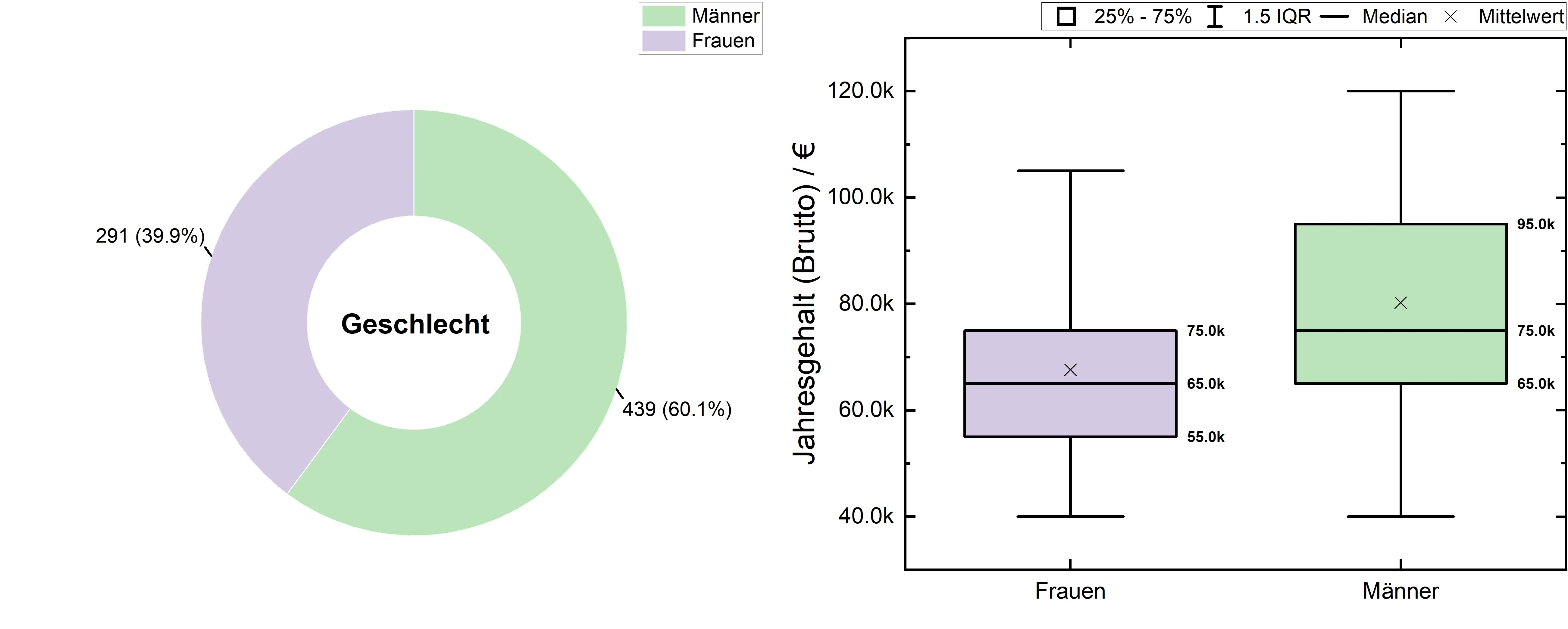 Die Gesamtauswertung der Geschlechterdifferenzierung ist in Abb. 8 zusammengefasst. Von den 730 Teilnehmerinnen und Teilnehmern waren 291 (39,9%) weiblich und 439 (60,1%) männlich. Bei der Analyse der Einkommensangaben zeichnet sich sowohl beim durchschnittlichen Einkommen als auch bei den Maximalgehältern ein höheres Einkommen bei Männern ab. So liegt das durchschnittliche Jahreseinkommen bei den befragten Frauen bei 65.000€ und bei den Männern bei 75.000€. Das entspricht einem Unterschied von fast 15%. Auch gaben lediglich 0,7% der Frauen an, ein Jahreseinkommen von über 120.000€ zu beziehen. Bei den Männern waren es immerhin 5,6%. Die Diskrepanz zwischen Männern und Frauen zeigt sich auch unter Berücksichtigung der Berufserfahrung und des akademischen Grades (vgl. Abb. 9 und 10). Es fällt jedoch auf, dass sich die durchschnittlichen Gehälter mit zunehmender Berufserfahrung zunehmenden angleichen (s. Abb. 9) und höhergradige Abschlüsse (insb. Habilitationen) unter den befragten Frauen seltener auftraten (s. Abb. 10).