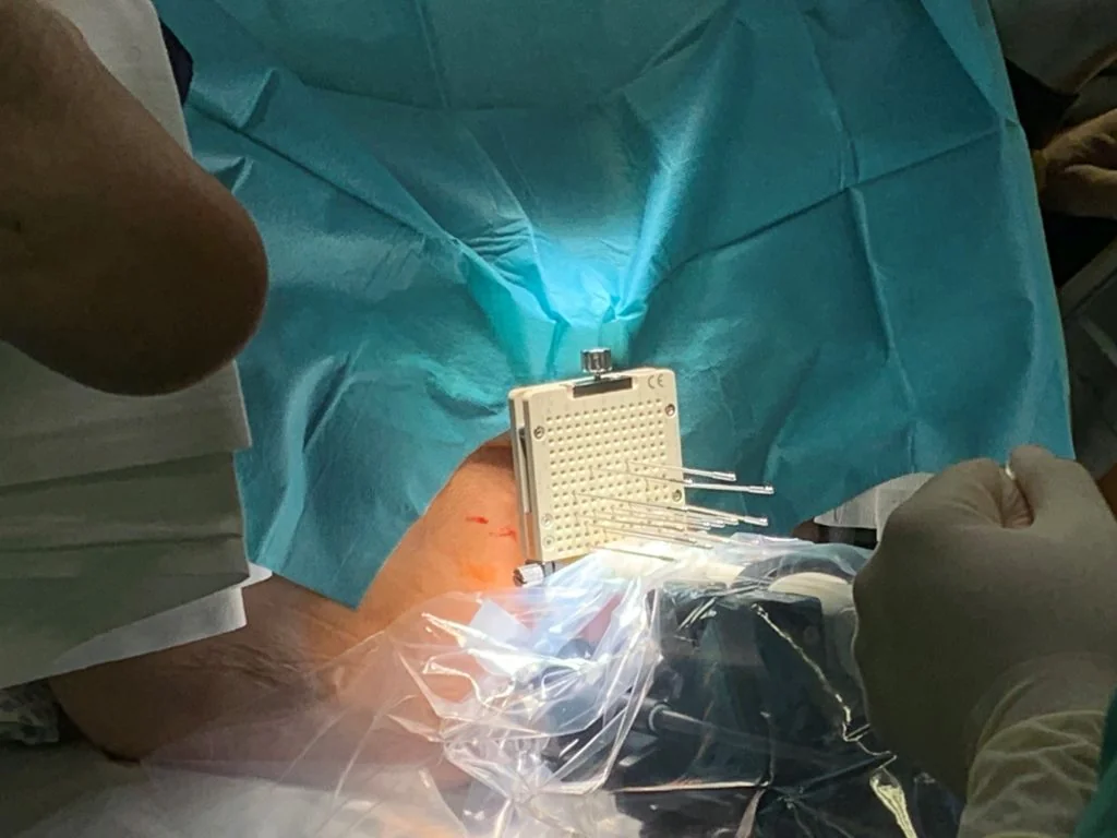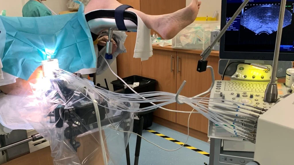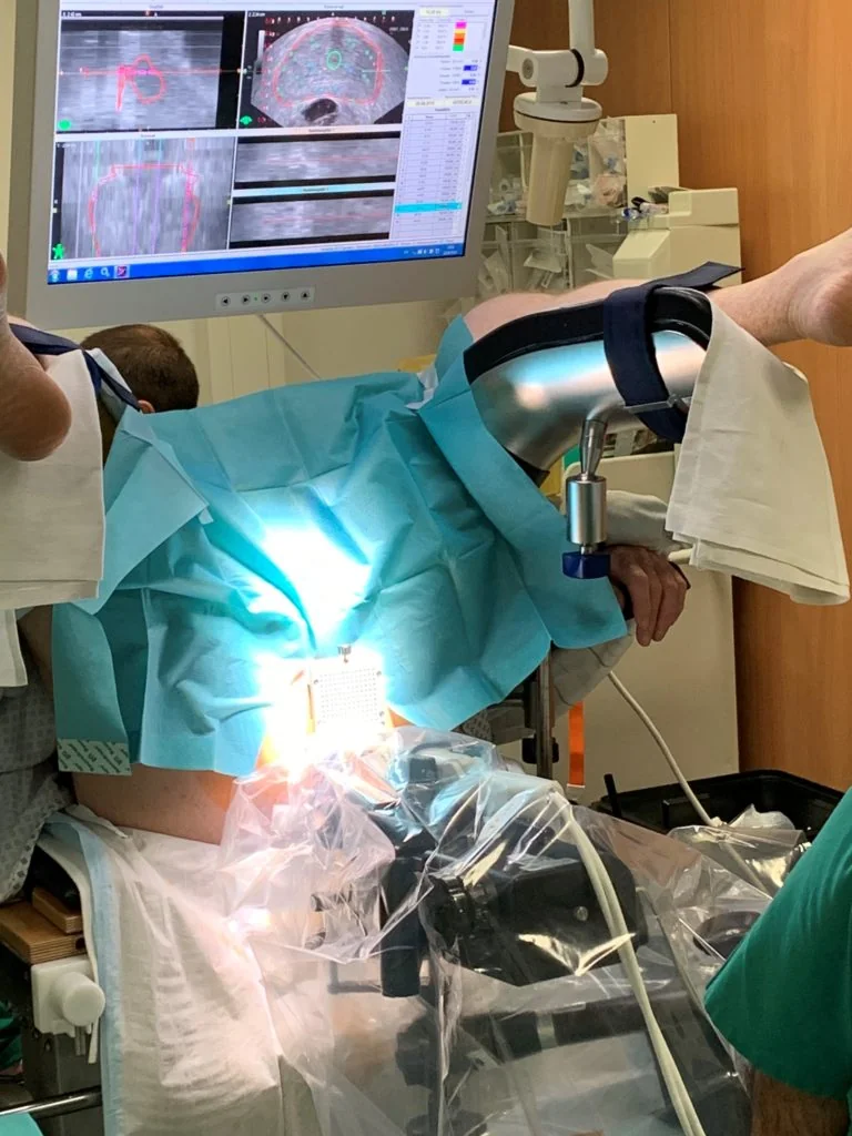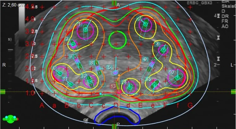 Vorbereitend platziert der behandelnde Arzt in Kurznarkose oder spinaler Anästhesie Spickungsnadeln in dem zu bestrahlenden Bereich der Prostata. Zur Lokalisierung der Nadeln wird eine Ultraschallsonde rektal eingeführt die mithilfe eines Ultraschallsteppers schichtweise Aufnahmen ermöglicht. Zur Fixierung werden die Nadeln in ein Template (Platte mit Löchern) gesteckt. Diese gewährleisten eine präzise Bestrahlung. Nachdem die Nadeln implantiert worden sind, wird auf Basis der Ultraschallschnittbilder eine individuelle Dosisverteilung berechnet. Diese Berechnung basiert üblicherweise auf dem TG-43 Formalismus. Die Berechnung kann entweder instantan, ohne Beendigung der Kurznarkose, erfolgen oder zu einem späteren Termin. In der Regel werden 1-2 Fraktionen angeordnet, je nachdem welches Therapiekonzept (Monotherapie oder Boost) verfolgt wird.