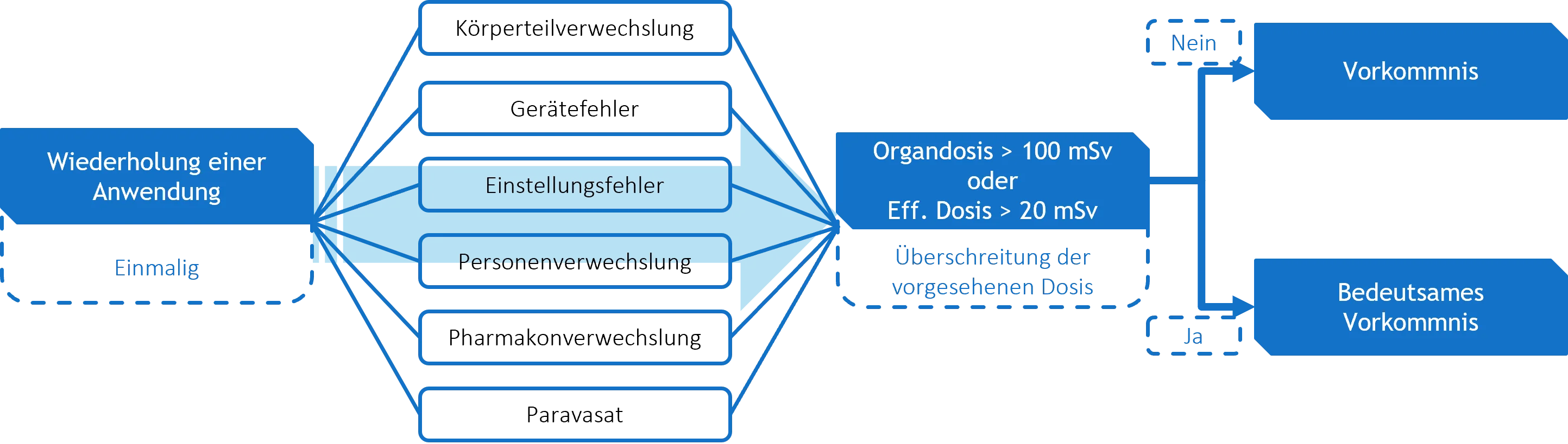 Grundlage für diese Zusammenfassung ist der Leitfaden zum Umgang mit Vorkommnissen in Röntgendiagnostik und Nuklearmedizin von M. Borowski et al. der im Rahmen eines vom Bundesamt für Strahlenschutz geförderten Ressortforschungsvorhaben entstanden ist. Einige Teile wurden übernommen, einige Teile ergänzt oder weggelassen. Wir bedanken uns herzlich bei Herrn Borowski für die Genehmigung, den Artikel verwenden und zitieren zu dürfen. Zur besseren Lesbarkeit wird auf korrektes Zitieren verzichtet.