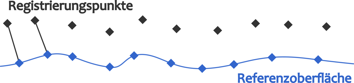 Die errechnete 3D-Oberfläche, die IST-Position des Patienten, dient nun zum Vergleich mit der Referenzoberfläche. Die Referenzoberfläche wird aus der Oberfläche des Bestrahlungsplanungs-CT generiert und im DICOM-Format an das SGRT-System exportiert. Die Abweichungen zwischen den beiden Oberflächen werden bspw. durch eine rigide Registrierung errechnet. Die Registrierung läuft in diesem Prozess durch den Iterative Closest Point (ICP)-Algorithmus ab. Das heißt, der Algorithmus vergleicht die IST-Oberfläche mit der Referenzoberfläche und bringt beide Oberflächen durch ein iterativen Prozess auf einen minimalen Abstand.
