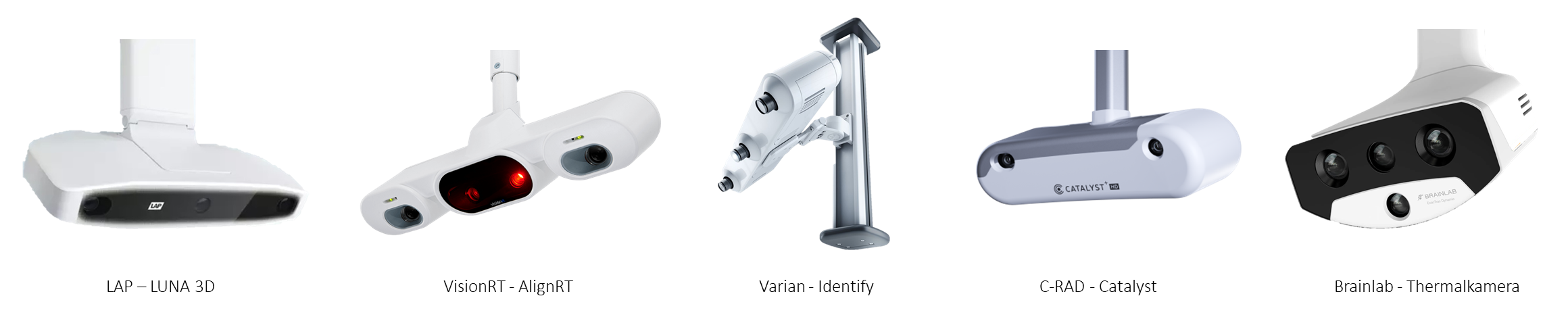 Zum Zeitpunkt der Erstellung dieses Artikels (10/2025) sind fünf Hersteller am Markt vertreten, die unterschiedliche technologische Ansätze zur Surface Guided Radiotherapy (SGRT) verfolgen. Bereits anhand der Gehäusegestaltung eines Systemkopfes lässt sich das jeweils eingesetzte optische 3D-Messverfahren grundsätzlich erkennen.
